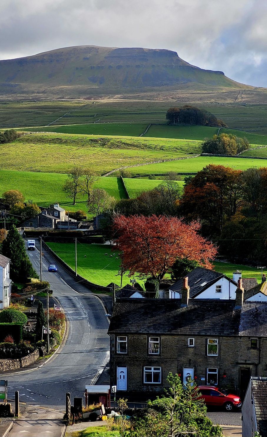 Below: Pen-y-ghent mountain above the sunlit pastures and colourful trees in Horton-in-Ribblesdale.