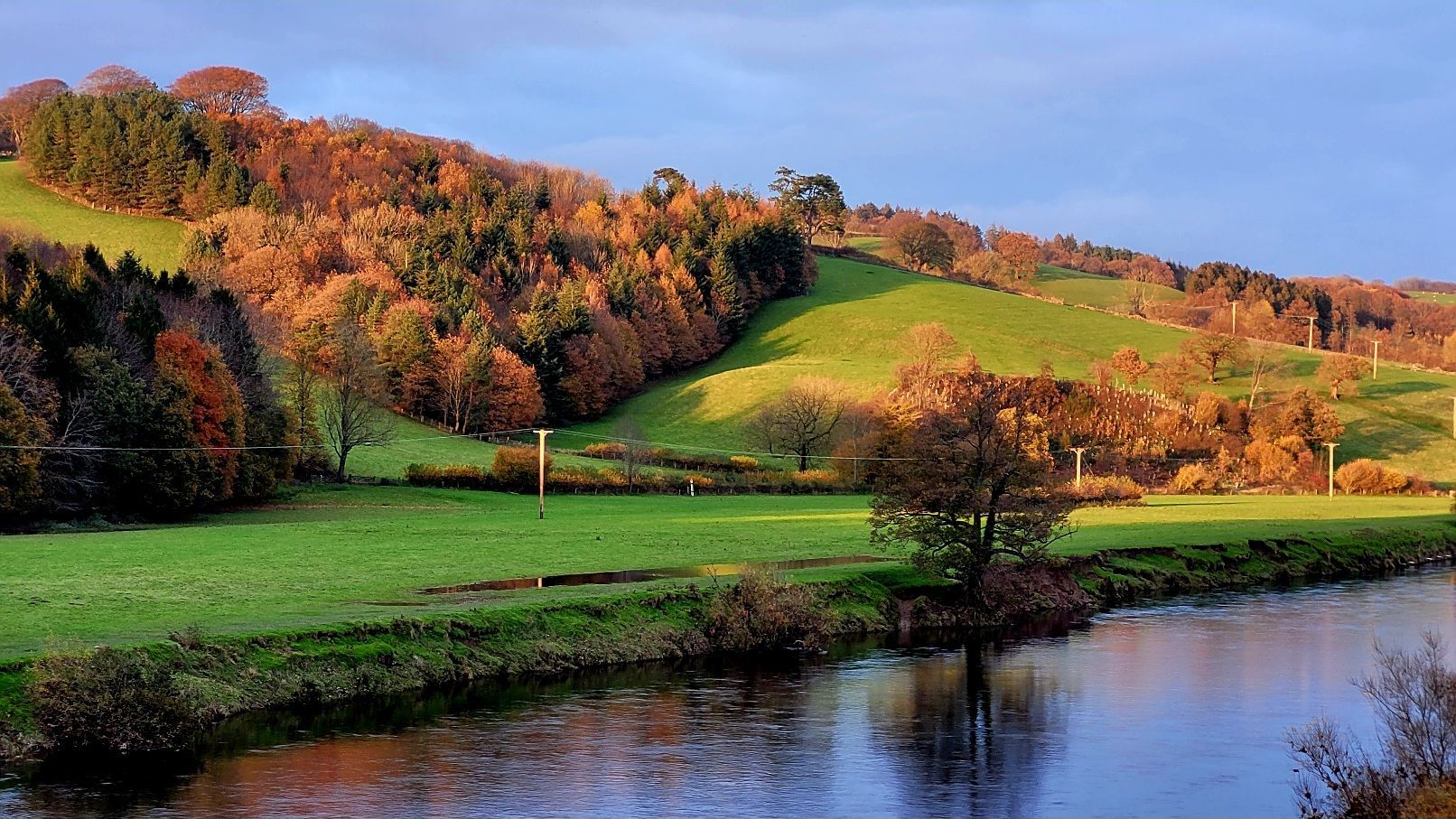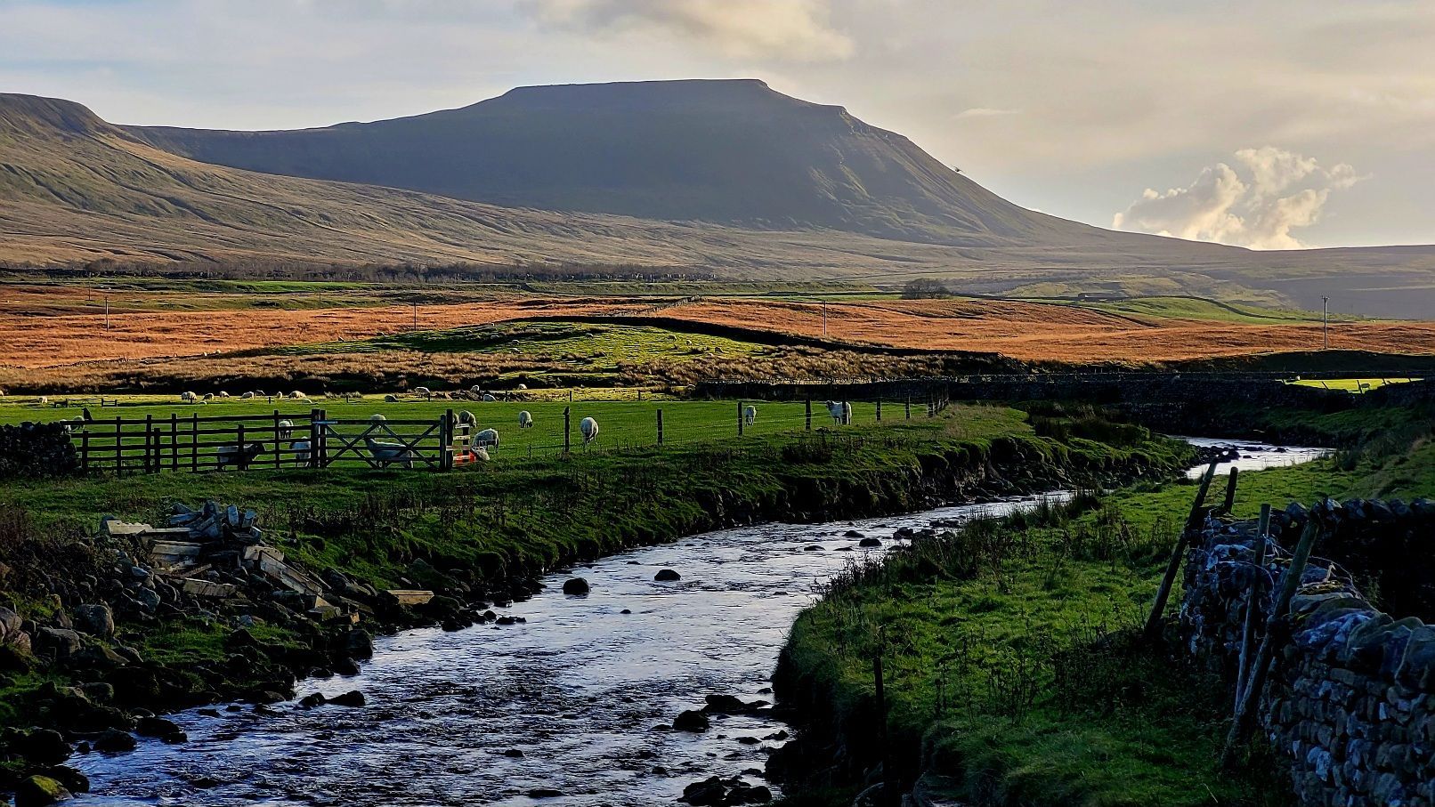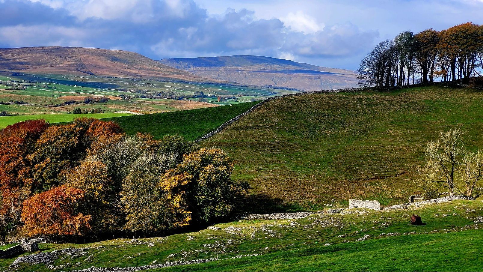 Above: Views across the autumnal landscape to the mountains of Ingleborough and Whernside.