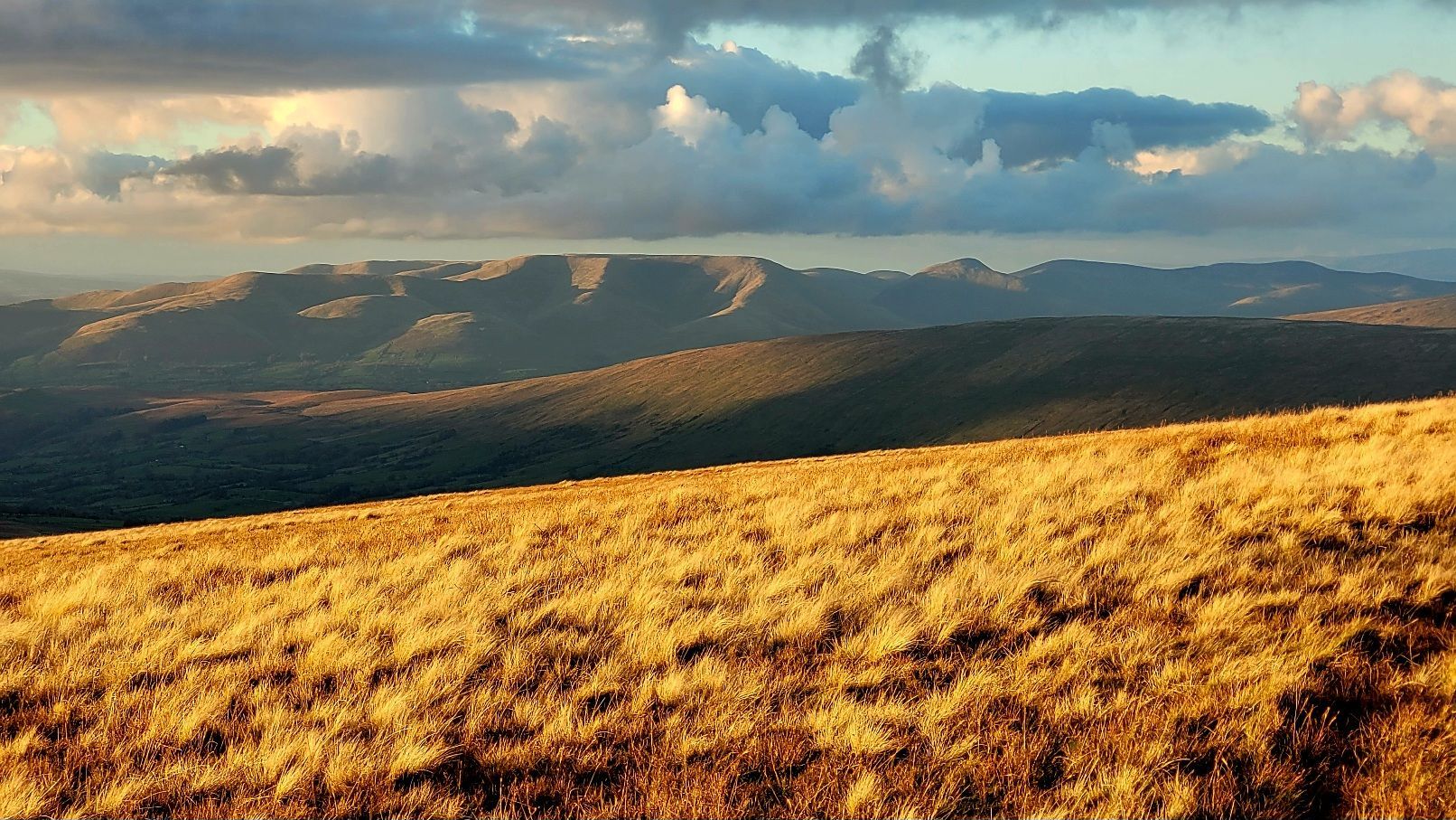 Above: View of the Howgill Fells from the summit of Whernside as the setting sun illuminates the land.